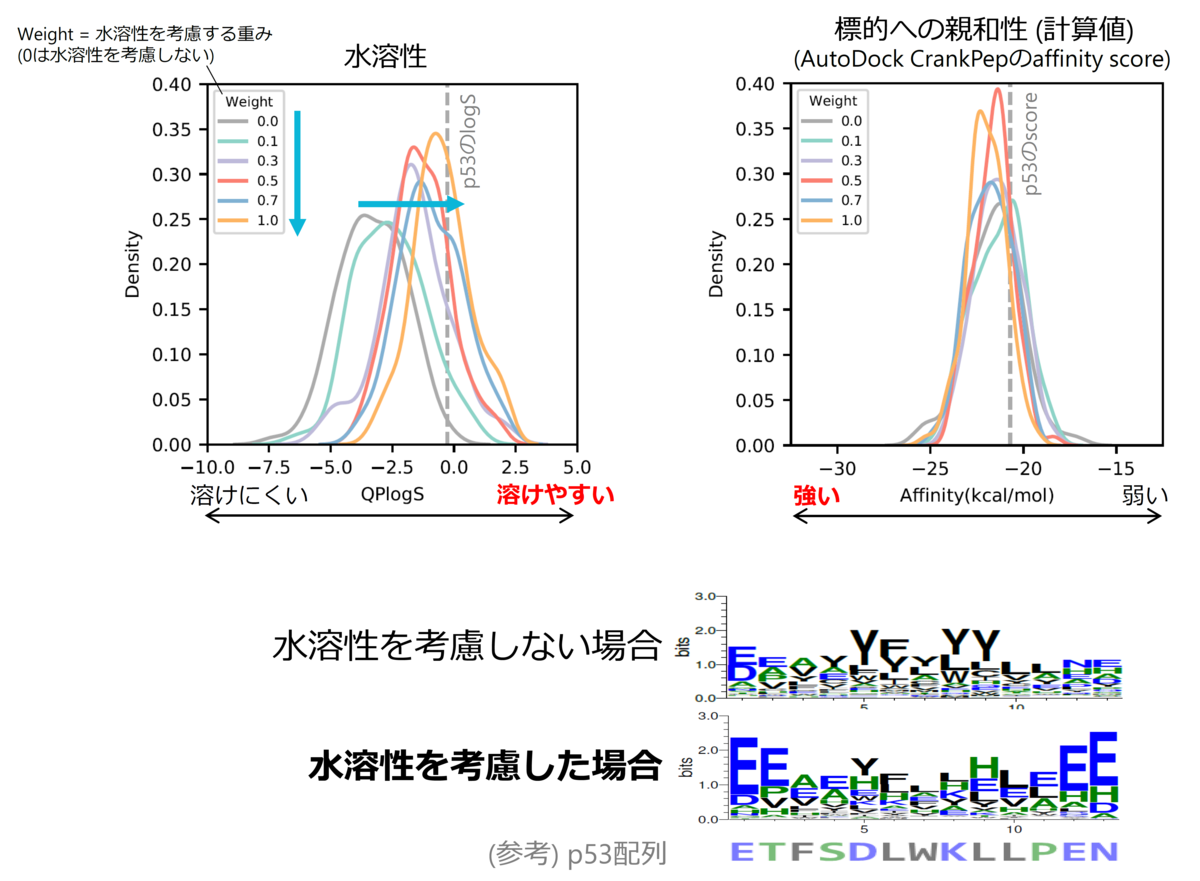 ところが、AfDesignによって生成された配列を確認すると、難水溶性のペプチドが多くを占めていた。タンパク質間相互作用の相互作用面は一般に疎水領域であり、AlphaFold2 (AlphaFold-Multimer) も相互作用面に共起しやすい残基の関係を学習していると考えられることから、タンパク質の表面に結合するペプチド配列をAlphaFold2によって設計しようとすると疎水領域を構成するように、すなわち疎水性残基を多用したペプチド配列が選ばれやすくなっているのだと解釈できる。だが、後の生化学実験などを考える上ではペプチドの水溶性は重要である。